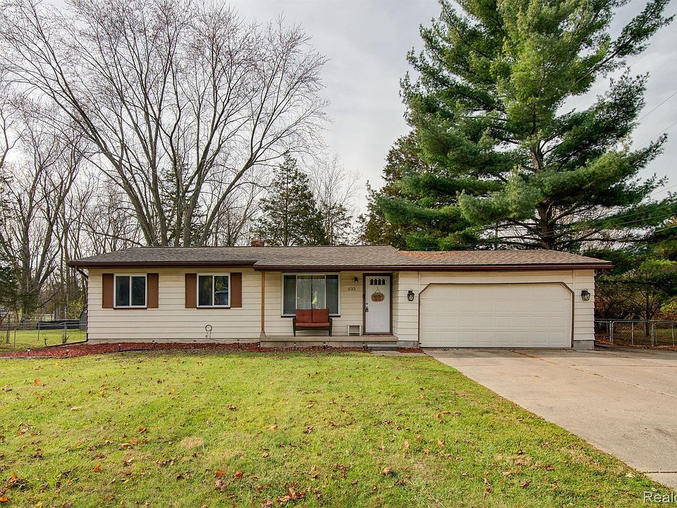 Welcome to this charming 3-bedroom, 1-bathroom ranch nestled on just shy of half an acre of serene land! This home features an inviting open floor plan, with a cozy living room bathed in natural light and accented by a bold feature wall. The updated kitchen boasts sleek cabinetry, stainless steel appliances, and a stylish backsplash, opening to a versatile dining or secondary living space highlighted by a charming fireplace and built-in shelving.