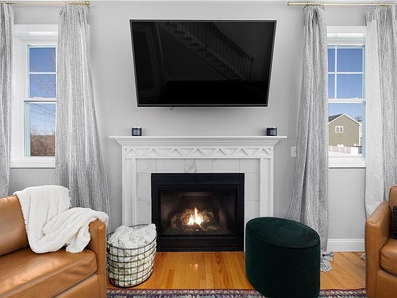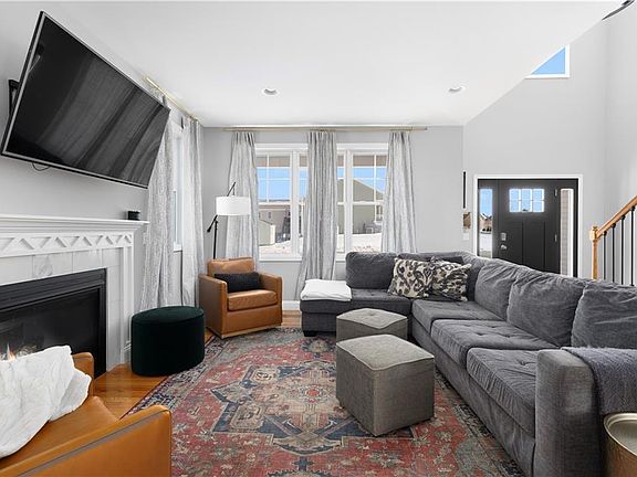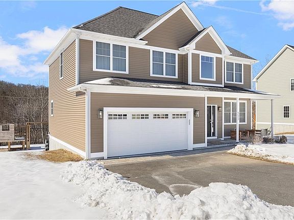 Approximately 2,098 square feet, this three-bedroom, two-and-a-half-bathroom house features a range of desirable amenities. The entry boasts a vaulted ceiling, complemented by a wrought iron staircase. The living space includes a gas fireplace in the family room, offering a cozy atmosphere. The center kitchen showcases a granite island, providing ample meal preparation space. Hardwood floors throughout the main level contribute to the home's warm and inviting ambiance. Climate control is maintained by a central air conditioning system, while a sprinkler system ensures easy lawn maintenance. The open concept layout allows for seamless flow between living areas, accentuated by the nine-foot ceiling heights. A kitchen pantry closet provides convenient storage space. The property is situated in a young subdivision, with the Blackstone River abutting the lot, offering serene river views. A two-car garage provides secure parking and storage space.