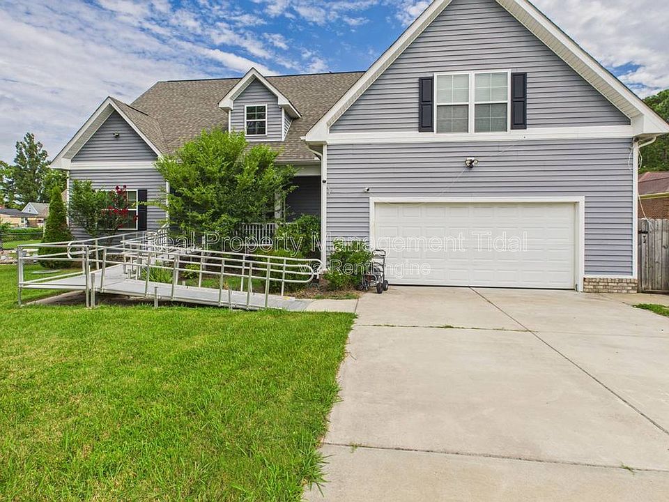 Down below, you'll find a covered concrete patio ideal for relaxing in the shade, plus a large shed for all your storage needs. The property also features a front porch, off-street parking, and a 2-car garage, giving you plenty of room for vehicles and guests. For added flexibility, there is a handicap-accessible ramp at the entrance that can remain or be removed at the tenant's preference.
