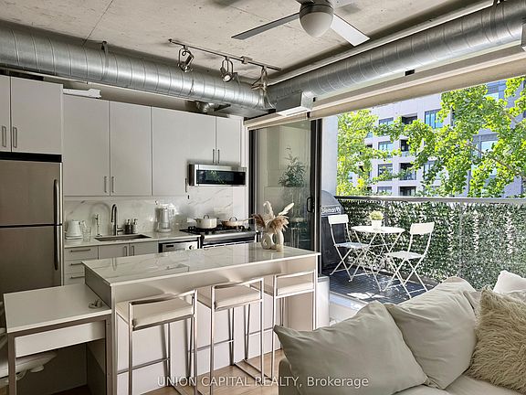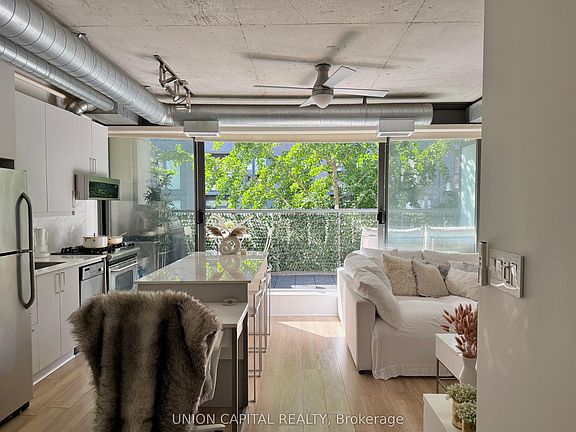 FULLY FURNISHED | Just pack your bags and enjoy this bright and stylish 1-bedroom loft that perfectly captures the best of downtown living in one of Toronto's most vibrant neighbourhoods. Step inside to discover exposed concrete ceilings and feature walls, industrial-style ductwork, and floor-to-ceiling windows that fill the space with natural light. Oversized double patio doors create a seamless connection to your spacious private terrace ideal for entertaining or relaxing. With a natural gas BBQ hookup and water connection, the terrace truly feels like an outdoor extension of your living space. Inside, you'll find gas cooking, built-in closet organizers, and an open-concept layout. Tucked away in a quiet boutique building just off Queen West, you're steps from Loblaws, Joe Fresh, Winners, LCBO, Waterworks, The Well and an endless selection of cafes, restaurants, and nightlife. Enjoy weekend strolls to Trinity Bellwood's Park, or explore nearby Ossington and King West. With a 100 Walk Score, 100 Transit Score, and 99 Bike Score, convenience truly doesn't get better than this.