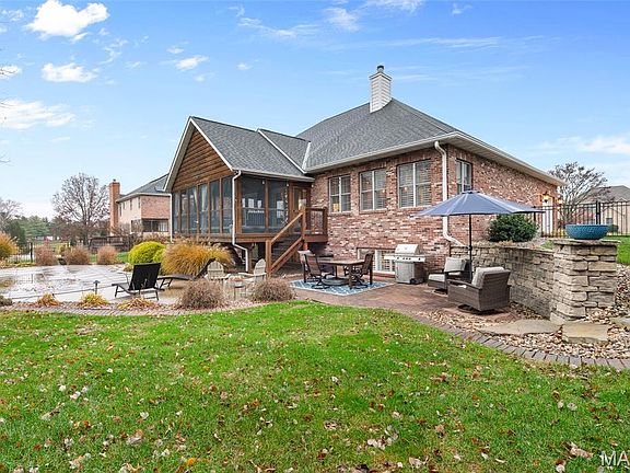 Step into a residence where refinement, craftsmanship, and comfort meet in perfect harmony. Overlooking the 3rd tee box at Fox Creek Golf Course, this sprawling, remodeled brick ranch stands out for its thoughtful details, striking curb appeal, and desirable cul-de-sac setting. Enter the foyer and experience an open, airy layout ideal for both living and entertaining. The dining room transitions seamlessly into the living room, with custom bookcases flanking the gas fireplace, creating a beautiful focal point. Two sets of 9' French doors lead to an impressive screened porch—perfect for taking in peaceful golf course views, lush landscaping, and the inviting pool and patio. The well-appointed kitchen offers the perfect blend of function and style with granite countertops, a spacious center island, abundant cabinetry, walk-in pantry, and a sunlit breakfast room. The main level also includes first-floor laundry and a luxurious primary en suite featuring a newer walk-in shower and a custom St. Louis Closet Company organization system. Two additional bedrooms, a full bath, and a half bath complete the main level. The lookout lower level extends the home’s exceptional living space with a large rec room, full wet bar, cabinetry, and bar refrigerator—ideal for hosting. A fourth bedroom, full bath, fitness room, office, and storage provide outstanding versatility. Outdoors, your private retreat awaits. The saltwater pool, fully updated in 2025 with a new liner, pump, and salt-cell generator, creates a true resort-style experience. Multiple seating areas, mature landscaping, and seamless indoor-outdoor flow complete this serene oasis. Additional premium features include plantation shutters throughout, tankless water heater, whole-house generator, and a newer roof—enhancing comfort, efficiency, and peace of mind. A meticulously maintained residence offering beauty, comfort, and remarkable views in a coveted golf course community. Fox Creek Golf Course has recently transferred ownership; the driving range is currently open, and the full course is anticipated to reopen in spring 2026, enhancing the long-term appeal of this desirable setting.