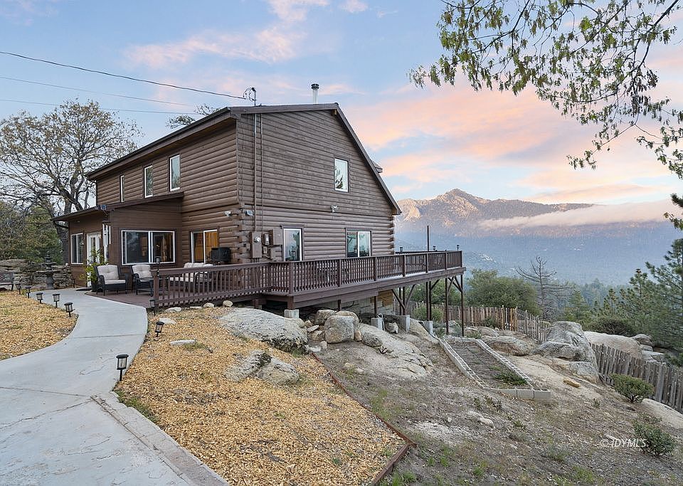 Sky View Estate: Introducing Sky View Estate, an exclusive mountain retreat on approximately one acre of tranquil land. This two-story log home, built in 2006, offers 2,498 sq-ft of living space with 3 bedrooms, 2.5 baths, and a versatile bonus room. Enjoy complete seclusion, with neighbors on only one side, and breathtaking mountain and valley views, including Lily Rock and Mt. San Jacinto. The four-sided wrap-around deck seamlessly connects indoor and outdoor living. The modern chef's kitchen features granite countertops, Alderwood cabinets, and ample storage. The main floor includes a spacious living room with a wood-burning stove, a bathroom, and a large bonus room. Upstairs, find three bedrooms with walk-in closets and stunning views. The primary bedroom has an ensuite bathroom with a soaking tub and a laundry chute. The property includes an oversized garage/workshop, ample parking, and a fully fenced yard for privacy. Additional features include owned solar panels, a backup generator, new rain gutters, high-efficiency windows and doors, a basement storage area, and a metal storage container. Own this private mountain sanctuary with luxurious amenities and breathtaking views.
