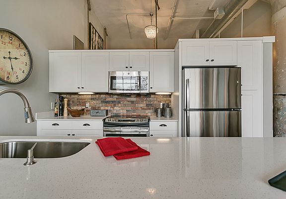 - White Cabinets with brick backsplash
