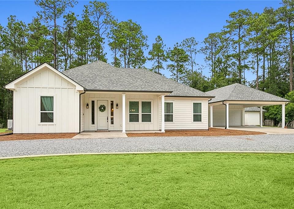 Pristine home w/ 10' ceilings throughout, wide open kitchen to den flow, private main bedroom w/ sizable bathroom/closet, and all hard surface flooring on .62 acres (200' wide x 135' deep) of flood zone C property backing up to woods, and 2 doors from Tammany Trace. Exercising enthusiasts encouraged. Park boat and/or RV onsite w/o any HOA concerns or fees! BIG 30'x25' garage/workshop w/ 1/2 bath (easy conversion to in-law suite?), and carport for 2 vehicles plus separate 10x8 storage shed. All structures have spray foam insulation and are tastefully designed with matching, durable exterior Hardie board. Low maintenance home with LOW utility costs (electricity avg $111/mo, natural gas avg $22/mo). Full house automatic Generac generator. Laundry room measures 12' x 6'. Original owners took pride in their home, and it shows!