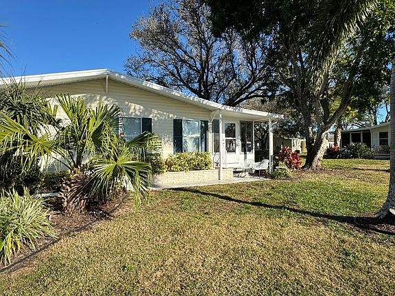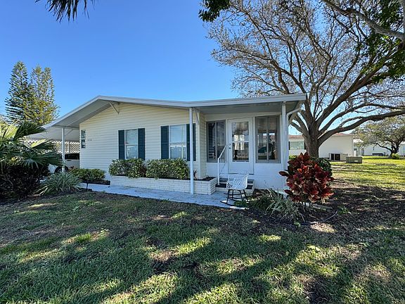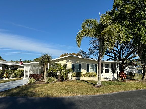 This property is situated on leased land, with an approximate monthly lot rental fee of $1,600 for the new owner. Please refer to the additional details and inclusions below. All showings, property information, community details, and application procedures should be coordinated directly through the listing agent. An exceptional opportunity awaits to own a beautifully updated residence in one of Sarasota's most sought-after manufactured home communities. Built in 1992 and offering just under 1,100 sq. ft. of living space, this charming home has undergone extensive upgrades, addressing all major components for peace of mind. Recent improvements include a new shingle roof, HVAC system, fresh interior paint, luxury vinyl plank flooring throughout, hurricane-impact windows and doors on the enclosed lanai, and a spacious new outdoor concrete patio. Nestled quietly at the end of a friendly cul-de-sac, the property boasts striking curb appeal with a pale yellow vinyl exterior complemented by deep blue and crisp white accents, creating a vibrant tropical aesthetic. The oversized yard features mature trees, lush landscaping, and ample shaded areas perfect for outdoor living. The extended driveway, large covered carport, and detached storage shed provide convenient space for bicycles, golf clubs, pool or beach gear, and also house the included washer and dryer. Inside, a neutral color palette and vaulted ceilings enhance the home's airy and open feel. Large windows flood the living areas with natural light, while the open-concept layout seamlessly connects the living room, dining area, and kitchen-perfect for entertaining. The kitchen is fitted with white cabinetry, granite countertops, and all appliances, plus a breakfast bar for casual dining. The generously sized living room easily accommodates today's larger furniture pieces and opens directly onto the newly renovated lanai, complete with impact windows and doors for year-round enjoyment. This inviting space also provides access to the front lawn and the oversized concrete patio, offering abundant room for gatherings or quiet relaxation. The guest bathroom has been tastefully updated with a tub/shower combination, newer vanity, toilet, mirror, and fixtures, and is conveniently located near the spacious guest bedroom, which can comfortably fit a king-sized bed. The primary suite offers two closets, vaulted ceilings, views of mature shade trees, and a private ensuite bath featuring a step-in shower, updated fixtures, and a modern vanity. Additional updates include refreshed electrical components, plumbing improvements where needed, new lighting and ceiling fans, and window coverings throughout. This home is being offered fully turn-key furnished-just bring your suitcase and start enjoying the Florida lifestyle immediately. Community & Lease Information - Located within Camelot East Village, a premier gated 55+ pet-friendly community, residents enjoy resort-style amenities, including a heated pool, spa, sauna, bocce and pickleball courts, outdoor kitchen and BBQ area, fitness center, game rooms, technology center, and a variety of monthly activities and events. The monthly lot rent covers annual property taxes, water, sewer, weekly trash and recycling collection, lawn care, trimming, blowing, and irrigation. All information is deemed reliable but not guaranteed. Buyers are encouraged to verify all details.