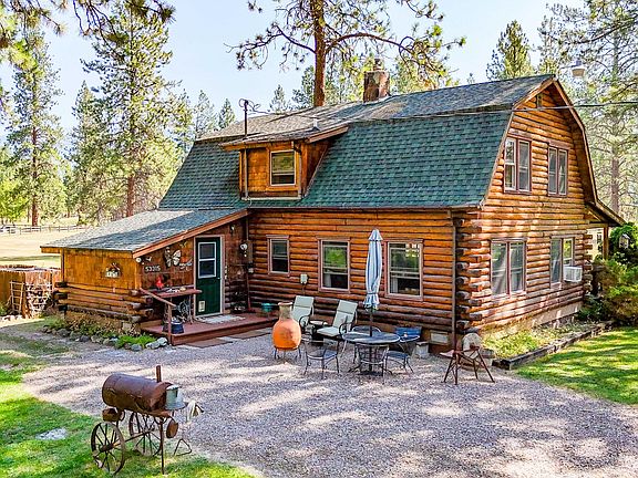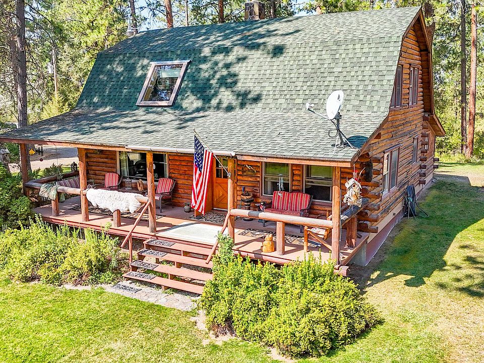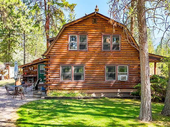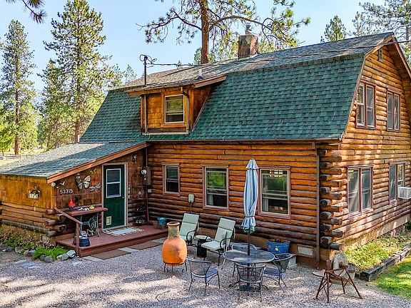 Nestled at 53315 Timberline Way, Charlo, Montana, this single-family residence offers an inviting home ready for move-in within the expansive landscape of the Mission Mountains in Lake County. The living room presents a captivating space, where the warmth of the propane fired living room stove and the rustic charm of a log home are complemented by a beamed ceiling, creating cozy sophistication. The kitchen and dining space for culinary endeavors and gatherings, extending the home's distinctive aesthetic into a private retreat. Outside, the property boasts a 5 acre lot, offering space to breathe and explore, room for horses and animals, along with a shed, covered deck and patio for enjoying Mission Mountain views. The gambrel roof adds architectural interest, while the laundry room provides functionality. The year around freely flowing Marsh creek adds to its privacy and charm. Enjoy the Beautiful Ninepipes reservoir for hunting and fishing. Don't forget the wood fired Hot tub!