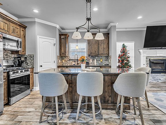 This stunning 3-bedroom, 2.5-bath home offers a perfect blend of elegance and modern design. From the moment you step through the luxury entry door, you are greeted by tile floors that flow seamlessly throughout the main living areas and beautifully crafted wood stairs accented with a stylish railing. The custom kitchen is a true centerpiece, featuring rich cabinetry, granite countertops, a spacious island, and a premium gas stove that makes cooking both efficient and enjoyable. Crown molding runs throughout the home, adding a touch of sophistication, while the focal gas fireplace with its striking masonry work creates a warm and inviting atmosphere. Extra lighting enhances the bright and open feel, and the upstairs includes a convenient stackable washer and dryer closet. With its thoughtful details, luxury finishes, and timeless appeal, this home is truly a beautiful place to call your own. All appliances and mounted TV stays with property with a full price offer.