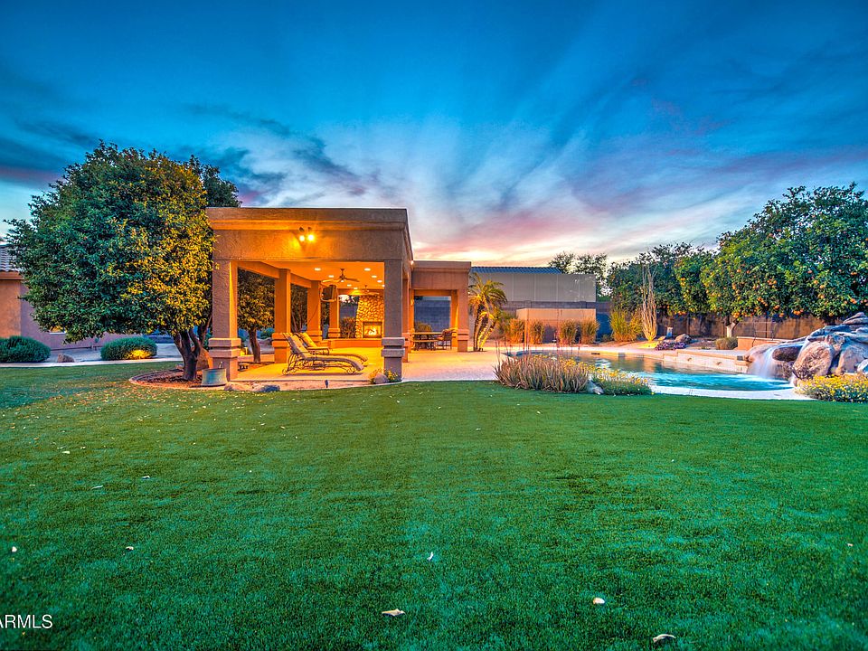 This semi-custom luxury home is designed for grand living. Enter to an open floor plan defined by soaring ceilings and architectural details perfect for showcasing your art collection. The chef's kitchen boasts dual ovens, dual dishwashers, dual sinks & wet bar. Your backyard is a sprawling paradise: a covered patio, complete with built-in BBQ, recessed lighting, fans, misting system; a play pool with water slide; a stone fireplace in the adjacent ramada; and a thriving koi pond with gentle waterfall. With synthetic grass and space for RV parking, raised gardens, and storage, this yard truly offers everything. Retreat to the enormous primary suite featuring a cozy fireplace and a luxurious steam shower and jetted tub. The suite also includes a private fitness room with direct access to the yard..-- a seamless transition from workout to cool-down. A split junior suite offers a separate entrance, ideal for guests. Two additional bedrooms share a large Jack-and-Jill bath, and the front office is flexible enough to become a fifth bedroom. This home is as smart as it is beautiful. Enjoy the convenience of switch-controlled window shades and a Tesla charger in the 3-car garage. A 2020 cement roof (warrantied to 2035) and 2022 Trane HVAC systems provide future peace of mind.