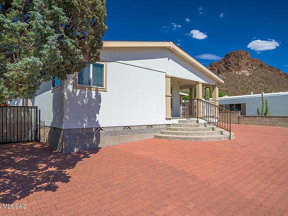 This home is nestled in the sought-after Tucson Estates 55+ community. This spacious 2-bedroom plus den manufactured home is a rare find! Sitting on a generous lot, this property offers both space and comfort, with beautifully laid pavers surrounding the perimeter for easy maintenance and added charm. Step inside and discover a truly one-of-a-kind layout featuring wide hallways, a massive kitchen with two sinks, a large island, perfect for entertaining, and ample storage including two separate storage units. The whole-home water softener ensures comfort and convenience in every corner. The primary suite is a retreat of its own, boasting an en-suite bathroom with dual showers. This home is move in ready. Don't miss your chance to live in one of the most popular communities in Tucson! Tucson Estates is known for its active lifestyle, amenities like a golf course, pickleball, tennis, hiking, pool and its location near the Tucson Mountains. The community is conveniently located near shopping centers, restaurants and other services.