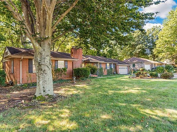 All brick ranch home on large corner lot has great bones and plenty of space. Open living / dining room and eat in kitchen are perfect for holiday gatherings and hosting dinner with family and friends. Hardwood floors in living room, dining room, sun room and all 3 bedrooms. Two full baths on the main level. Off street parking for several cars is a breeze with two car garage and paved parking area. Two brick, wood burning fireplaces add ambience and warmth to the home. Enjoy morning coffee in the private sunroom just off the living room. Lower level offers a large family room with 2nd fireplace and built-in shelving. The home also has an attic fan. A large fenced backyard with paver stone patio has mature trees and landscaping for shade and added privacy. Shed in backyard stays with the property. Immense potential just waiting for your personal touches! Easy access to shopping, schools and highways.