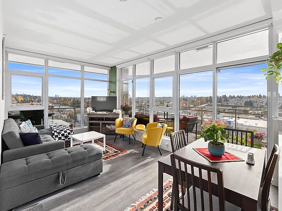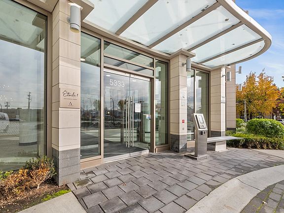Welcome to Etoile, where modern elegance meets effortless Brentwood living. This rare 2 bed+ den, 2 bath corner home invites you to live both indoors and out, featuring 879 sqft of refined interior space and an extraordinary 377 sqft wrap-around balcony. Soaring ceilings and wall-to-wall windows frame sweeping city and mountain views, while a sleek kitchen with Bosch appliances and a waterfall island anchors the home. The den offers the perfect work-from-home retreat. Unwind in spa-inspired bathrooms or entertain under the stars on your heated terrace. Resort-style amenities include a fitness centre, steam rooms, outdoor pool, hot tub, and concierge. Steps to SkyTrain, Brentwood, parks, cafes, restaurants, and Whole Foods. Urban living, elevated.