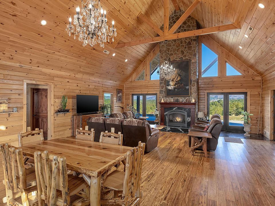 Custom southland log homeGranite islandFloor-to-ceiling stone fireplaceCopper farmhouse sinkBreathtaking panoramic viewsGourmet kitchenSamsung appliances