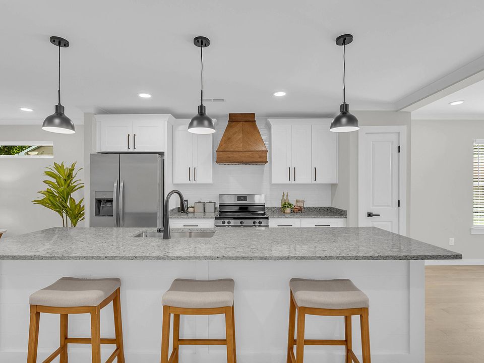 The spacious kitchen is the centerpiece of the home, featuring a large kitchen island and plenty of room for gathering. The adjoining dining area is flexible enough to serve as two separate spaces—ideal for entertaining or creating a cozy breakfast nook.