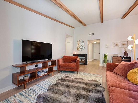 This move-in ready 2-bedroom, 2-bath condo is tucked away in a quiet gated community offering resort-style amenities. Enjoy luxury vinyl plank flooring, vaulted ceilings, a cozy fireplace, and a bright kitchen with a garden window perfect for herbs and plants. The primary suite features a walk-in closet and balcony access, while the second bedroom is ideal for a guest room or home office. With updated baths, included washer/dryer and refrigerator, this home is truly turnkey. Relax on your private balcony or head to the pool, spa, clubhouse, or tennis courts. All just steps from Trader Joe's, Target, coffee shops, and Northridge Golf Course.