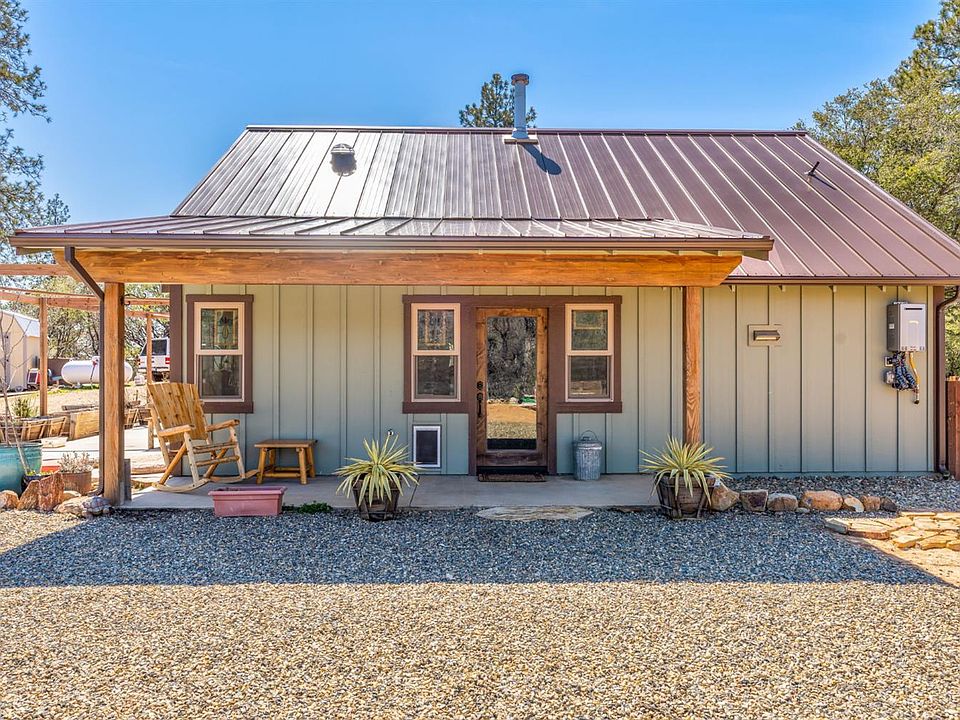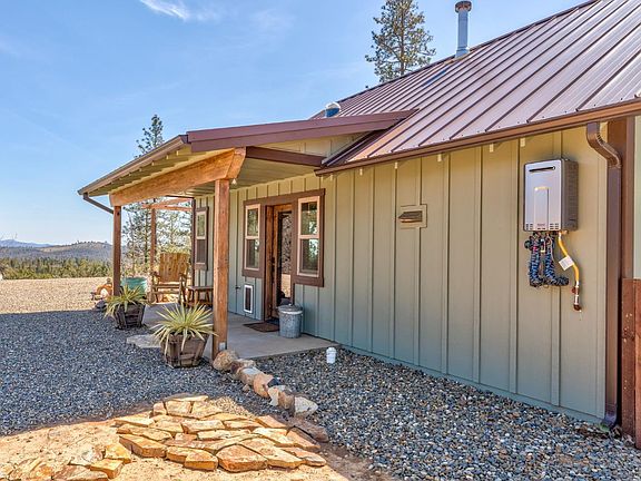 Off-Grid Modern Cabin on 20 Private Acres with Stunning Sierra ViewsExperience peace and privacy just 15 minutes from Mariposa in this newly built, artist-designed 2BD/2BA home. Set on 20 forested acres with panoramic mountain views, the 1,000 sq ft residence features high ceilings, an open floor plan, and upscale finishes including rustic alder cabinetry, butcher block counters, and wood-look vinyl flooring.Enjoy seamless indoor-outdoor living with patios on all sides, fenced yard for pets/kids, and a 4-acre fenced perimeter with electronic gate. Off-grid infrastructure includes a 20-panel solar system, 10kW Generac generator, on-demand hot water, wood stove, and well with 2,500-gallon tank. Fiber optic internet available. Additional sheds and bear-proof garbage box included. Ideal for full-time living or a high-end vacation rental.