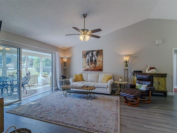 OUTSTANDING POOL HOUSE ON GOLF COURSE! This lovey 2BD/2BA house has a very open floor plan with view of the pool and the golf course. This house has been completely remodeled with all new Samsung kitchen appliances which include a time-saving dishwasher, built-in microwave, refrigerator with a clear top range and stove. The extended countertop makes it easy to place stools underneath for relaxing. The open living room is very comfortable and can hold a large, big screened television. The laundry room is right off the kitchen with access from the garage to make it easy to bring in groceries. The Master Bedroom has ample room for a King Size Bed, night stands and 2 dressers. This Master has walk-in closet for easy access to your clothes. The Master Bathroom has recently been remodeled with a double sink vanity, with lots of storage, walk-in Shower and soaking tub for getting rid of stress. The guest bedroom is also a good-sized room with a large walk-in closet. This room also has a tray ceiling and ceiling fan for air circulation. The Florida room has tile flooring and has a great view of the pool and outside golf course grounds. The pool has a screened Cathedral enclosure with plenty of room for a chaise lounge and chairs. Come enjoy the great life in this affordable house with a pool on the golf course. rom the Florida room of the 3rd hole of the golf course. You can sit back and just enjoy life as you enjoy watching the golfers and the many birds. Ocala Palms is a gated active 55+ community located on North Highway 27 in Ocala, Florida. This community offers an 18-hole Golf Course for golf enthusiasts and Country Club-Style living for active adults. Golfers can also practice on the driving range and putting green so they can step up their golf game skills. It boasts a 19,000 square-foot clubhouse. Here is a sample of activities and amenities offered: Clubhouse/Amenity center, fitness center, Outdoor Olympic pool, hot tub, heated indoor pool, card room, arts & crafts studio, ballroom, library, billiards, bocce ball, shuffleboard courts walking & biking trails, volleyball court, tennis/pickleball courts, horseshoe pit, and croquet lawns. Ocala Palm is a very family friendly community and is located close to shopping centers, supermarkets, drug stores, restaurants, banks, doctors’ offices, hospitals, postal office department stores, etc. For family entertainment, Ocala features year-round public festivals events, canoeing, kayaking, paddle boating, horseback riding, fishing, etc. Close to tourist attractions like World Disney Parks, Universal Studios, Sea World, Bush Garden, World Equestrian Center, numerous beaches, etc. All measurements are approximate. Buyer(s) to re-measure.