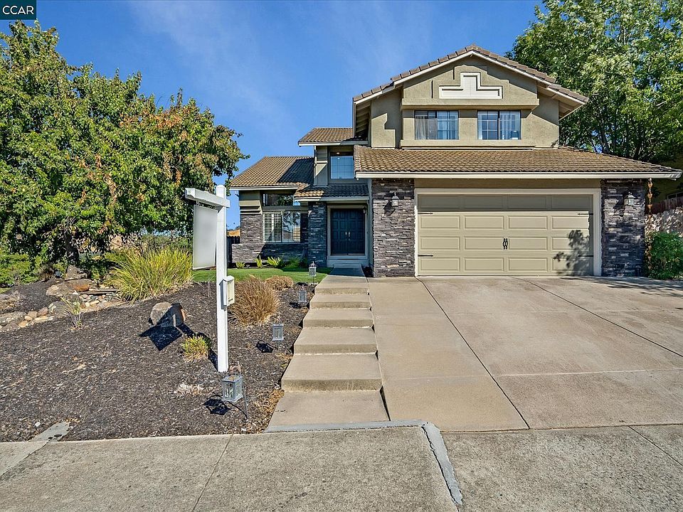 Welcome to this fantastic home at Vista Point! Situated on over half acre of land this home has it all. Cul-de-sac location, corner lot, desirable well established neighborhood. Close proximity to Elementary, Middle and High Schools. Great open floor plan. Formal living and dining rm with vaulted ceiling. Updated kitchen with all SS appliances, double oven, gas range, island with breakfast bar, eat-in kitchen with lots of storage. Adjacent large family rm with a fire place and office space or a wine bar. Fully updated main level bathroom, laundry rm and access to the garage. Upper level has a primary suite retreat with vaulted ceilings, closets, updated bath with a walk-in shower, jetted tub and hillside views. Two other spacious bedrooms down the hall, updated hall bathroom w. double vanity. Fourth bedroom with French doors is being used as an office. Resort style backyard with a sparkling pool, artificial grass, large deck surrounded by amazing Views.