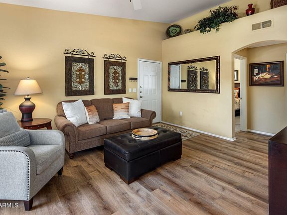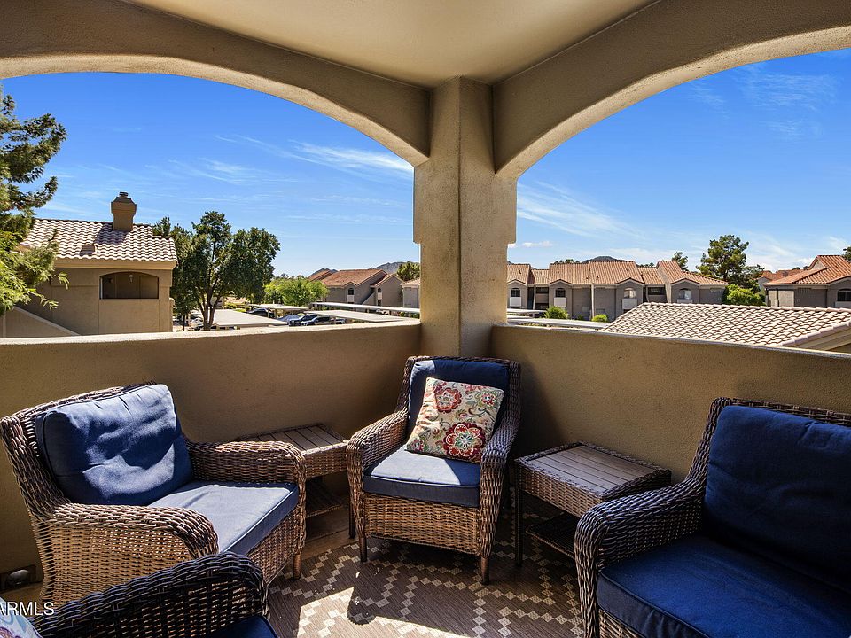 Located in the heart of Paradise Valley, this 2-bed, 2-bath split floor plan unit with 1,070 sqft of living space is beautifully appointed and conveys fully furnished. The open floor plan features a spacious living room with vaulted ceilings, large windows for ample natural light, and a private balcony to enjoy Arizona's beautiful weather. The kitchen offers modern appliances, plenty of cabinetry, and granite countertops. Both bedrooms are generously sized, with the primary bedroom offering an en-suite bath and walk-in closet. The second bathroom is conveniently located near the second bedroom, perfect for guests or shared living.