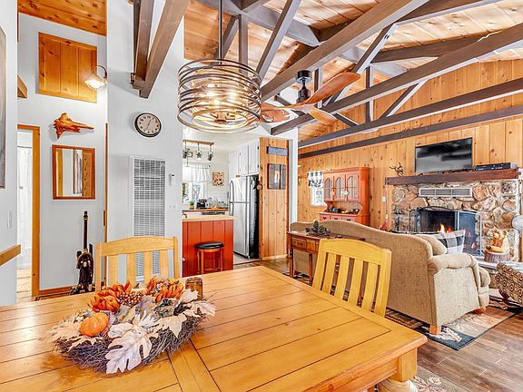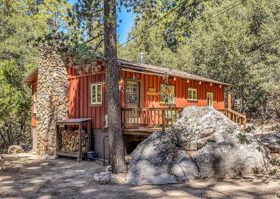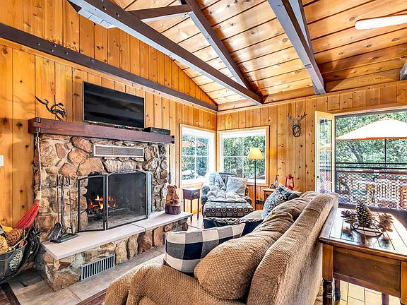 Welcome to ''Rock Pine'', where towering pines and manzanitas paint the quintessential San Jacinto landscape. Step through the original Dutch door and you're greeted by soaring vaulted ceilings and a space big enough to kick off your boots and do a dance! The living room centers around a striking rock fireplace, framed by charming, original cabin windows that let the outdoors in.The kitchen has been thoughtfully remodeled, featuring subway tile, butcher block countertops, slate tile floors, and lovingly preserved vintage appliances. The dining area is spacious enough to host all your friends and family for cozy gatherings. Step through the French doors onto a freshly painted deck, where pines, manzanitas, and the gentle sounds of a seasonal creek create the ultimate mountain escape. The bathroom blends style and function with a new vanity, slate tile, and added storage. Vaulted beam ceilings extend from the living through both bedrooms, with the primary bedroom offering French doors to the deck and the second bedroom perfectly sized for guests or a cozy home office. Kick off your boots, sip your coffee, and let the mountains do the rest!
