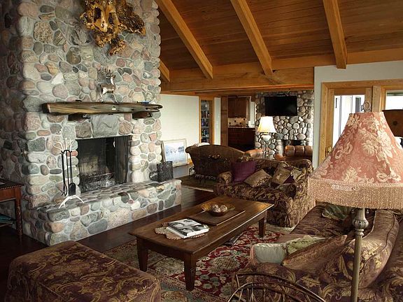 Spectacular waterfront home with 165 feet of frontage. The home, in excellent condition, features 3 bedrooms, 4.5 baths, 4 fieldstone fireplaces, totally updated kitchen, main floor master suite, and one bedroom - one bath guest apartment with a fireplace above the 3 car garage. Deep lot, private, estate size parcel.