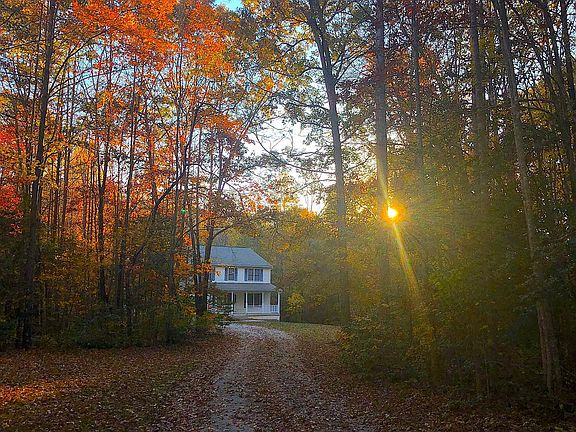 Pretty and Private Nestled in the Trees. Shown by appointment only - please do not drive down driveway without an appointment. 5.07 private acres with 4 bedrooms, 3 full baths, plus an full unfinished walkout basement with full sized windows across the back of the house. Attractively sited approximately 386 feet from the road, the exquisite homesite is a pleasant surprise at the end of a scenic driveway that journeys curve by curve through the wooded wonderland. A gentle slope along the sides of the house makes for a perfect walk-out basement. The sizeable back yard fades into the woods that lead to a meandering stream with even more woods beyond. Enjoy striking views from your full front porch, large rear deck, or spacious patio. The appealing floor plan welcomes you in with generously proportioned rooms and well-planned traffic flow. You'll love the abundance of storage - double door pantry and a double door utility closet plus a separate laundry room are conveniently located off the kitchen. The kitchen with stainless steel appliances (microwave just replaced) and has lots of cabinets and counter space plus a breakfast nook with sliding glass doors onto the BIG deck with BIG patio underneath. The family room is nice and cozy with a gas fireplace and is open to the kitchen on one side and the living room on another. French doors to close off the living room make for a great multi-use space...perhaps, an office. There's a convenient bedroom and a full bath on the main level, too. Additional spacious bedrooms upstairs include the primary suite that has 2 walk-in closets and a luxury bath with separate tub and shower and a double vanity, and bedroom 2 has a walk-in, too. There's plenty of room to expand in the huge thoughtfully planned walkout basement with rough-in plumbing for a future bath AND a wet bar, plus 2 dedicated electric outlets - one for a refrigerator and one for a freezer. The oversized 2 car garage with automatic opener is extra deep to allow for long vehicles and extra storage. There's a side entrance to the garage, too. Out by the road, there's a great cleared area with a pathway that provides a peek of the house. The approximate location of the front property lines are staked with bright yellow ribbon on them. The HOA is mostly for the purpose of road maintenance in this private community consisting of large lots ranging from 5 to 21 acres. House Location Survey available upon request. Measurements are approximate.