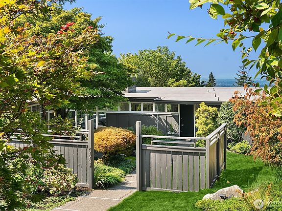 Mid-Century Modern Designed by Roland Terry This rare architectural one level home is located in the secluded Hilltop community founded by renowned UW architects with the intent of preserving original design & character Situated on a private lot of 31,500 sq ft, west facing, spectacular views of Lake Washington, Puget Sound, downtown Seattle & Olympic Mtns This home highlights iconic mid-century modern with walls of glass, hardwoods & polished concrete floors that blend indoor & outdoor living Thoughtfully updated, including plumbing, electrical, windows Remodeled kitchen featuring Calacatta marble island, quartz countertops & luxury stainless-steel appliances. Landscape with lush native plants, private setting & serene outdoor patios