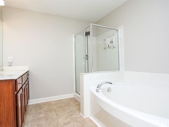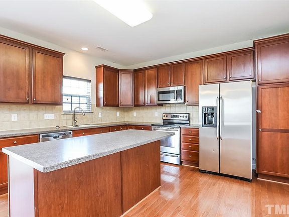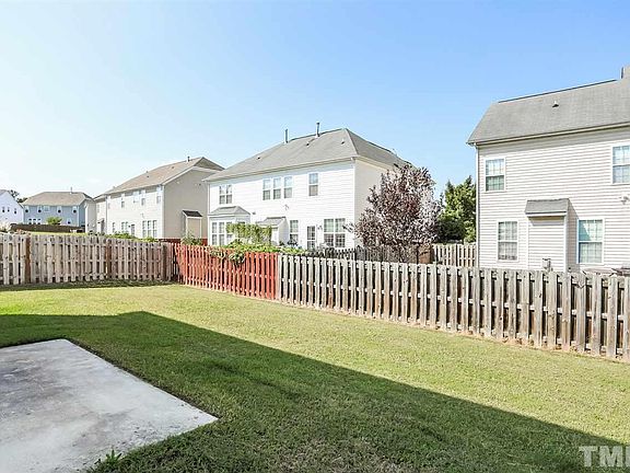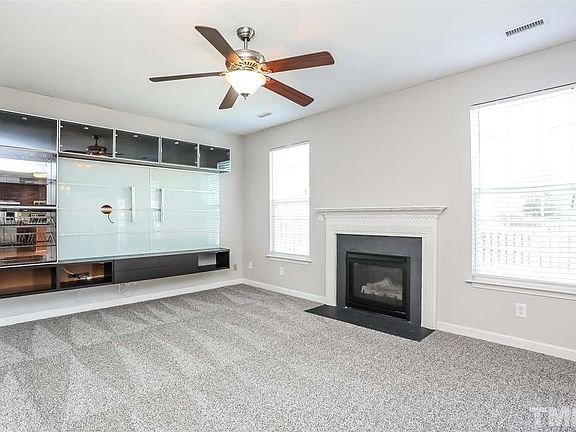 This Raleigh two-story home offers a patio, hardwood flooring, a fireplace, kitchen stainless steel appliances, a nearby park, and a two-car garage.