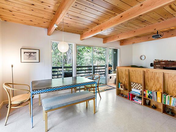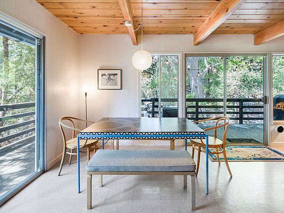 High in Fern Valley on a quiet cul-de-sac, set among large granite boulders and mature trees, this 1977 mountain cabin has been thoughtfully updated and is a testament to the owners artful sense of design. Style and functionality exist in harmony here, the layout of the home and the way the spaces flow together creates a feeling of comfort not often found in houses like this in Idyllwild. Outside you'll enjoy a seasonal creek that winds it's way through the property, local hiking trails are just a short walk from your doorstep. So many updates! On the main floor you'll step into the open living area with a beautifully designed custom kitchen with Bosch appliances, new marmoleum tile throughout the house exudes charm. The downstairs guest bedroom looks out at moss covered boulders. Two bedrooms upstairs are spacious and light, one of which offers access to a private balcony overlooking the property. Both bathrooms are tastefully updated with new tile and high quality fixtures, toilets and sinks. New wall heaters in each room are very effective and allow for excellent tempature control for each space. The electric panel is recently upgraded and includes a 240v EV charger.