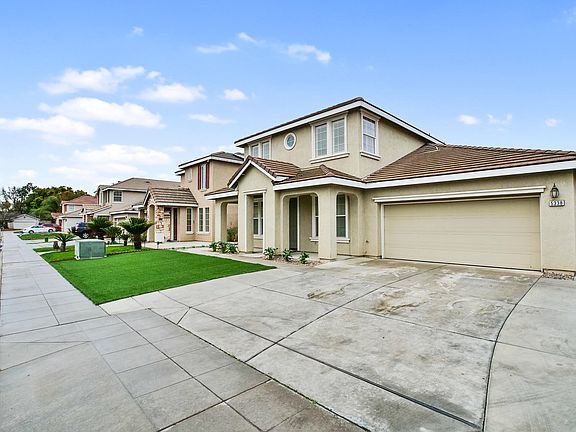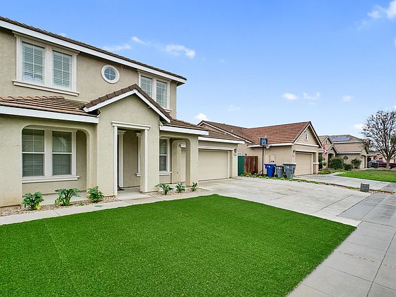 This attractive home was built by Beazer Homes and has a stately exterior design accented by the low maintenance and drought friendly front landscaping with faux grass. The floorplan is open and spacious featuring four bedrooms, two and a half baths, formal living and dining areas, as well as family room and kitchen nook and bonus room. Previously used as a fifth bedroom this oversized bonus room downstairs could also be a media room, play room, large office, or whatever you desire. An open kitchen with island and seating at the counter makes entertaining easy and enjoyable. It also features a pantry, new dishwasher and oven. Some of the lovely features include handsome wood-look tile floors, new neutral carpeting with new pad on stairs and upstairs, freshly painted grey walls, six inch baseboards, crown molding, and shutters throughout. The large backyard has a covered patio in the roof line, extra cement on the sides and in back. There's room to accommodate the most creative plans.