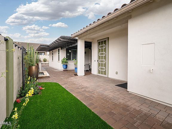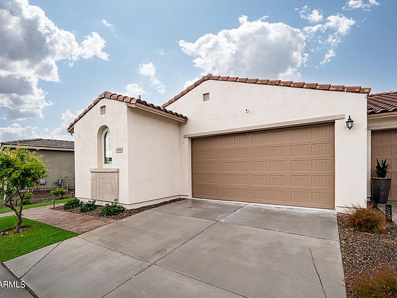 This is the nicest townhome in the Sky Ridge Community, Victory at Verrado with over $150,000 in upgrades including a remodeled kitchen, bathrooms and an entertainer's courtyard area with extended covered patio, a misting system, pavers, a wall fountain, built in BBQ and pizza oven! The Eclipse greatroom floor plan features 2 bedrooms, 2.5 baths and a two-car garage with bedroom 2 acting like a guest suite with private bath and separate entry. The gourmet kitchen includes custom cabinets with 42'' uppers, soft close doors/drawers, upgraded granite counters, GE Monogram SS appliances with 6 burner professional gas cooktop, double wall ovens and a built-in Wolf coffee bar! The owner's suite is split to the rear of the home with patterned Berber carpet, custom ceiling fan and owner's suite bath has a custom, tiled walk-in shower, upgraded mirrors, new sinks and faucets. Laundry room includes extra storage cabinets and a stackable LG washer/dryer unit. The garage has extensive built-in cabinets for extra storage, epoxy floors, insulated garage door and a water softener. Additional features include plantation style shutters throughout, surround sound speakers, custom cabinets and wet bar at great room entertainment center, premium ceiling fans in all rooms, custom exterior drainage system and much more! Victory at Verrado is an award-winning Active Adult Community tucked into the beautiful White Tank Mountains with miles of hiking and biking trails. Community amenities include resort style pools, The Victory Club with a modern gym, spa, tennis and pickleball courts, numerous social clubs, activities, events and the Tom Lehman designed Victory Course. After a day of fun, be sure to stop by The Vic Bar & Kitchen for a round of drinks, some great food and enjoy the beautiful mountain views and Arizona sunsets.