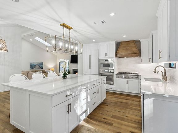 Large islandGas stovetopWhite quartz countertopsOpen floor planCustom shaker-style panelingHigh-end thermador appliances