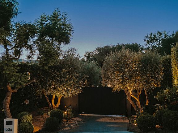 Pristinely positioned behind grand bipartite gates sits Trousdale Estates' most preeminent new-build residence. Welcome to 534 Chalette, where the designers and architects seamlessly blended Trousdale's three most coveted attributes into one sumptuous home: ultimate privacy, extraordinary build quality and dramatic skyline vignettes. Eight ancient Sevillano olive trees welcome you into the gated motor-court while Euroline steel case French doors lead you into the main home entrance. The bespoke crystal and hand-blown glass chandelier shines through the foyer skylight making for an incredibly dramatic entrance to the home, flanked by unobstructed skyline and ocean views in every direction. The custom kitchen was imagined by Molteni&C Creative Director Vincent Van Duysen in a sweeping open layout designed to maximize the room's natural light, creating a dialog between the outdoors and indoors. Cabinetry in black matte lacquer and lava stone countertop surfaces are complemented by bronze metal finishings for an ultra luxurious palette that seamlessly conceals bespoke Gaggenau appliances.The home's primary bedroom features dual separate bathrooms and walk-in closets crafted in larix dark wood with piqu drawers, bronze metal finishings and transparent glass doors. The closets are configured with 2 parallel sides offering an array of storage and a wall-length mirror on the far wall. The walls in the primary are lined with an intricate 505 system in glossy anthracite with dark brown leather shelving and glass sliding doors, offering customizable storage operated by remote control for books, a television, and miscellaneous personal effects.All additional bedrooms have custom onyx en-suite bathrooms and feature Euroline steel doors leading to the outdoors from every room. Additional amenities and features in this one-level compound include: a home theater, fitness center, sitting room with gorgeous bronze-built wet bar, designer wine cellar, and a nationally recognized glass blowing sculpture in Skylight called "Galaxy" by David Gappa, designed specifically for this property, and includes 400 individually blown glass orbs with clear, frosted and opalescent glazes. OVER $1,000,000 worth of furniture and art is also included in the purchase price. The acquisition of this custom estate is an opportunity not to be missed.
