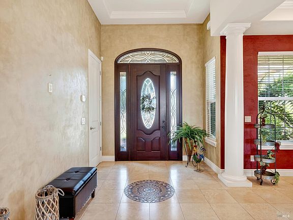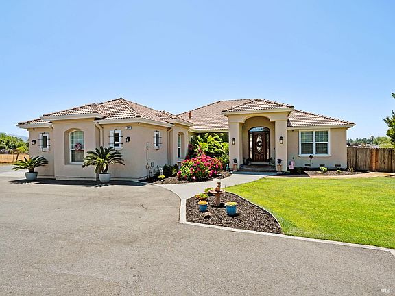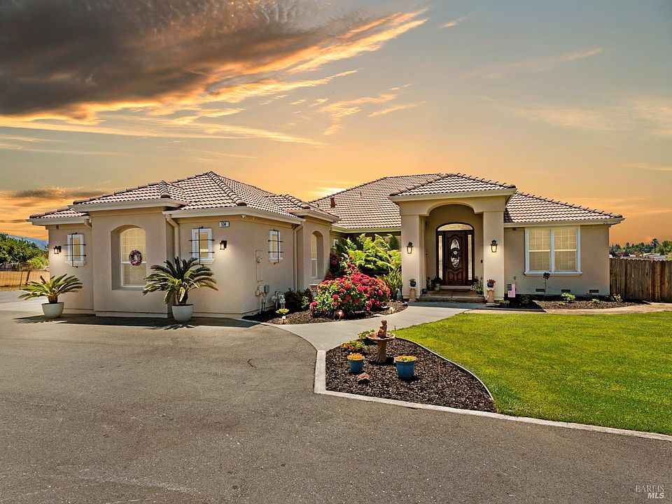 Tuscan inspired gated estate on almost 5 acres with stunning hill and mountain views. Built in 2007, this 3,032 sq ft. home features a gourmet kitchen with expansive island, prep island with vegetable sink, 6 burner Dcor range with pot filler, custom tile backsplash, cherry cabinets, wine refrigerator, double ovens, and a large walk in pantry. Elegant interiors include Venetian plaster walls in the living and dining rooms, a gas fireplace with limestone mantle, wall sconces, a leaded glass designer front door, travertine flooring and neutral carpet throughout. A bright spacious laundry room with cabinets, sink, and counter space. A gorgeous primary bath with granite counters and radiant heated floor. Outdoor living areas include landscaped front and back yards including a BBQ area, a covered patio and room for a pool. Property is fully fenced and gated with neighboring sheep grazing beyond the landscaped areas. Additionally there is a 3 car garage and a detached 2,970 sq ft barn/workshop with office space and storage, offering endless possibilities for agricultural use, business operations, car collections, or hobby needs. The land is serviced by well and septic, with natural gas and electricity. A rare opportunity to own a beautifully finished home with acreage.
