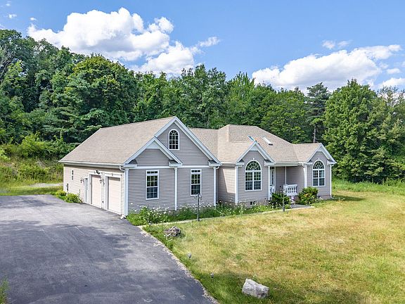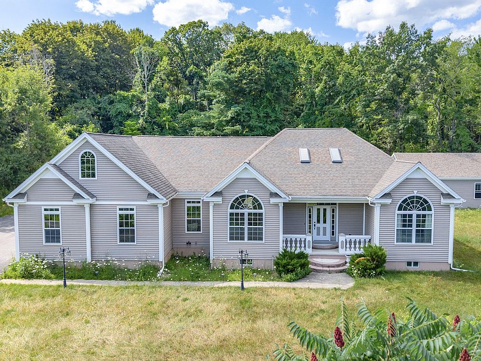 A rare & elegant offering - this custom, meticulously maintained ranch is nestled on 4.89 private acr. Featuring 4 beds and 2.5 baths, the home showcases exquisite craftsmanship: custom trim, doors, windows, artisan tile inlays, bronze granite counters & rich cabinetry. The serene primary suite features a tray ceiling with ambient lighting, a spa-like whirlpool tub & a tiled shower. Arched entries & cathedral ceilings add timeless charm. Enjoy the covered patio w/gas line, freshly painted (Benjamin Moore) deck & hot tub under a pergola. Bonus: 25x30 detached garage/workshop, gas line in main garage, full home water manifold, and spacious basement for future expansion. 1-Year Home Warranty. This home is a true retreat, presenting refined design & impeccable attention to detail!