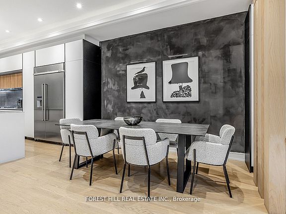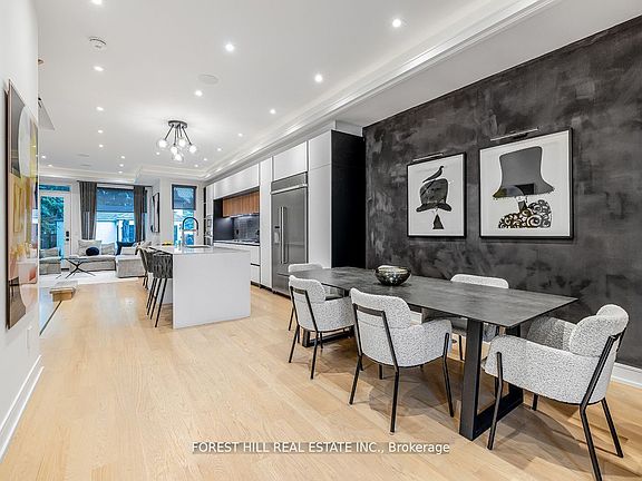 As soon as you step into this detached re-built family friendly home you are immediately wowed by the quality craftsmanship and modern finishes, in almost 3300 sq.ft. of living space. The open concept main floor boasts 10 foot ceilings. The living and dining rooms overlook a Chef's kitchen with large island and breakfast bar as well as a built-in wood table. Stainless steel appliances, compliment the sleek white cabinetry. The family room with gas fireplace connects seamlessly for easy living. Tall windows flood the home with natural light. Interiors include natural oak hardwood floors on 3 levels and laminate floors in the lower level, a dramatic floating staircase with glass railings, and striking millwork. The second floor has 3 bedrooms, one with an ensuite bathroom and the other two share a 5 piece semi ensuite bathroom. Convenient laundry Rm on 2nd Flr as well as an additional washer/dryer with sink the the furnace room. The third-floor primary suite is a serene retreat with a 5 piece ensuite bathroom and a large walk-in closet. The finished lower level with 8 foot ceilings includes a guest bedroom, 3 piece bathroom and a recreation room with a wet bar leading out to the landscaped artificial grass backyard. Fully fenced private backyard with large garage for storage. Unbeatable location just steps to trendy shops, restaurants, bakeries, spin studio, gyms, and much more along St. Clair West. Walking distance to Leo Baeck School, Humewood School and other private/public schools, parks, Cedarvale Ravine, public Transit and St. Clair West Subway.