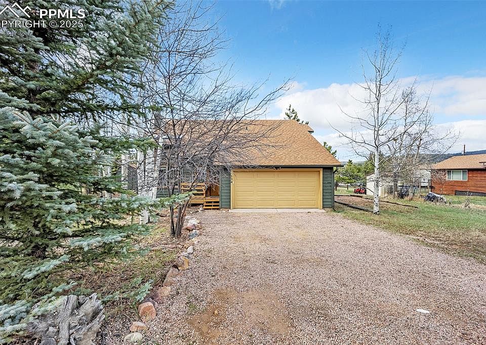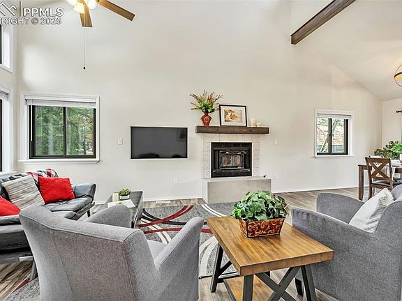 Embrace mountain living in this beautifully remodeled 3-bedroom, 2-bath home with a 2-car garage, offering almost 1500 sq ft of living space! Nestled in a quiet neighborhood within city limits, this property offers convenience with no HOA and is located about 1 mile from all the amenities of downtown Woodland Park. Enjoy a sunny, open-concept layout filled with natural light from south-facing windows and recently added skylights. The interior and exterior have been freshly painted and stained. Luxury plank flooring graces the living room, kitchen, and baths, while new carpet enhances the comfort of all bedrooms. The main level master bedroom suite features a walk-in closet and a fully updated ¾ bath. The spacious kitchen boasts custom butcher block counters with a large farmhouse sink, designer marble backsplash, stainless steel appliances, and pantry storage. The living room is highlighted by vaulted, open beam ceilings, skylights, and a cozy wood stove. Newer lights and fixtures add to the appeal, and the washer/dryer are included! Delight in the wonderful outdoor living space from both front and back decks and the large, level yard with plenty of elbow room – perfect for barbecues, frisbee, and outdoor enjoyment. A storage shed is included. Also, the house has the option of coming fully furnished for turn key living. There's ample room in the side yard to park your cars, toys, camper, and even an RV. Don't miss the opportunity to see this fantastic home! Schedule your showing today.