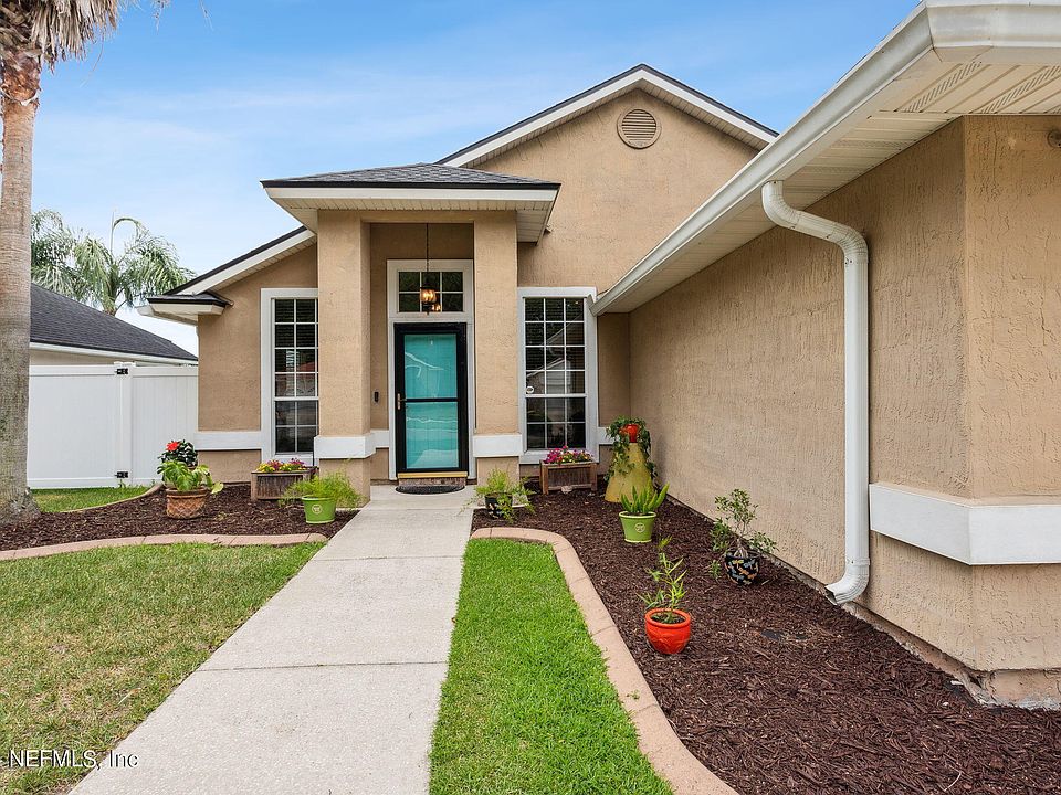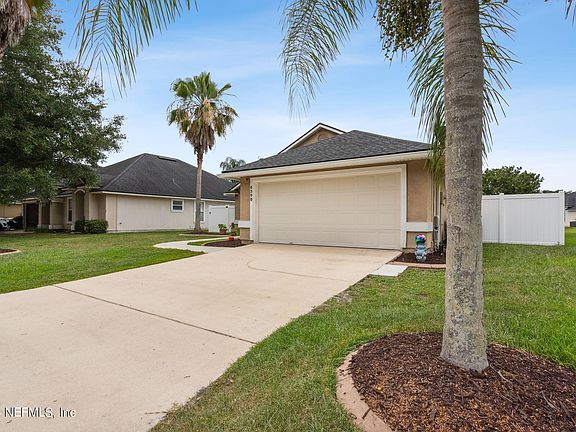 This stunning home, located in a highly sought-after Gardens of Julington community, offers breathtaking views of the lake. The low HOA dues add to the appeal of this exceptional property. Enjoy picturesque lake views from the comfort of your patio paver area which includes a covered and screened-in lanai, perfect for relaxing or entertaining. A fire pit adds to the outdoor ambiance. The kitchen boasts stainless steel appliances, granite countertops, and ample cabinet space, ideal for culinary enthusiasts. A separate, fenced-in area provides a safe and enjoyable space for your pets. French doors fill the living spaces with natural light, enhancing the home's bright and airy feel. The primary bedroom ensuite features his and her walk-in closets and vaulted ceilings, offering a private retreat. Qualified buyers can receive up to $2,000 credit toward closing costs and prepaids when they use preferred lender, Ali Howell with Forever Home Loans.