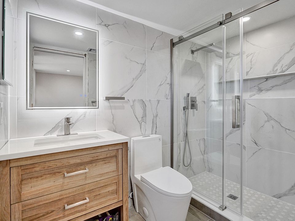 Exquisite top floor condo where modern sophistication meets attention to detail. Fully renovated from top to bottom, 2bedroom, 2-bathroom home offers fine luxury living. Ride the elevator to your oasis, where an open floor plan showcases high-end plank flooring and tons of natural light. NEW A/C System 2/7/2025 The gourmet kitchen boasts shaker cabinets, quartz countertops, stainless steel Smart Home enabled LG appliances, perfect for cooking and entertaining. Bathrooms have stunning large format tile, spa-like finishes. Recessed LED lighting throughout. Washer and dryer included. In a prestigious gated community, this condo offers a private lake, huge clubhouse and fully equipped gym. With 24/7 security.