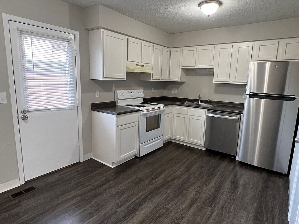 Private patioMove-in readyUpdated kitchenFresh neutral paintCrisp white trimDark countertopsBrand-new stainless steel appliances