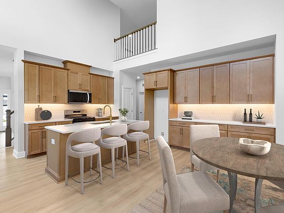 An airy extended foyer reveals the Horton Elite's impressive two-story great room with access to the rear yard. Central to a bright two-story casual dining area, the well-appointed two-story kitchen is enhanced by a large center island with breakfast bar, wraparound counter and cabinet space, and a sizable pantry. Complementing the gracious primary bedroom suite are a large walk-in closet and an elegant primary bath with dual-sink vanity, a large luxe shower with seat, and a private water closet. Overlooking a generous loft, secondary bedrooms feature roomy closets and shared hall bath with a separate dual-sink vanity area and linen storage. Additional highlights include a sizable basement with the option to finish, a convenient powder room, an everyday entry, a centrally located laundry, and additional storage throughout. Disclaimer: Photos are images only and should not be relied upon to confirm applicable features.