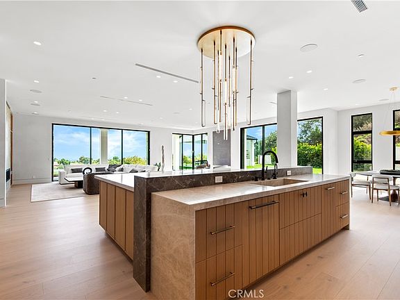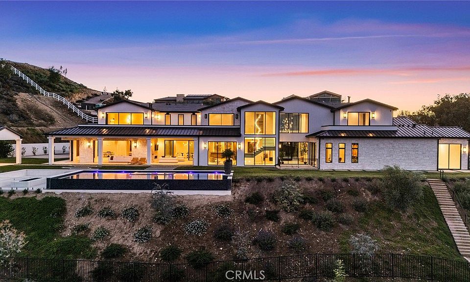 Panoramic views and curated design define this gorgeous, newly constructed estate, nestled at the end of a quiet cul de sac and sited on a large private lot within the guard-gated community of Hidden Hills. Perfectly positioned to capture the sweeping pastoral and city light views, this custom-built residence delivers a seamless blend of elevated architecture and indoor-outdoor living. The sunny, open floor plan centers around a stunning chef's kitchen with oversized island, prep kitchen, and counter seating that flows into the dramatic great room, anchored by a two-sided fireplace & sliding walls of glass that frame the endless views. Designed for grand scale entertaining and everyday comfort, the home features a spacious game and recreation room, custom home office, dedicated wellness wing with gym, steam room & sauna, a plush home theater with fabric covered walls, a sleek lounge with wet bar, and a glass encased, refrigerated wine cellar. Both levels include an additional den or flex spaces, and all six ensuite bedrooms are thoughtfully designed, connected by a floating architectural staircase and serviced by an elevator. The luxurious primary suite is a true retreat, complete with fireplace, stone-wrapped spa bath with steam shower, boutique sized custom closet, and a large, wraparound balcony with commanding views. The estate comprises four distinct structures. In addition to the main residence, which includes garages for seven cars with custom epoxy floors, the grounds feature a pool pavilion complete with a built-in barbecue and pool bath, a detached 965 square foot guest house tucked away on the lower pad for added privacy, and a two-stall barn/stable for equestrian or flexible use. Outdoor amenities are curated for year-round enjoyment and include a sparkling, zero edge infinity pool & spa, multiple covered patios, a fire pit lounge, exterior fireplace and a private pickleball court! Perfectly located within Hidden Hills, just a few blocks from the entry gate and close to top-rated public and private schools as well as The Commons at Calabasas, this one-of-a-kind estate offers space, sophistication, and 24 hour, guard gated security in one of Southern California's most sought-after communities.