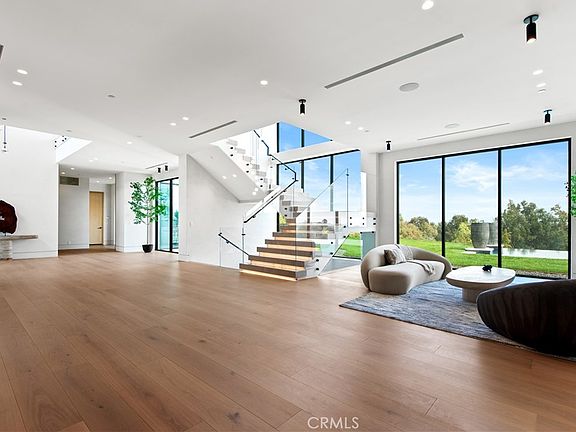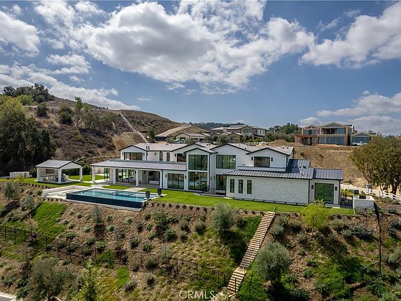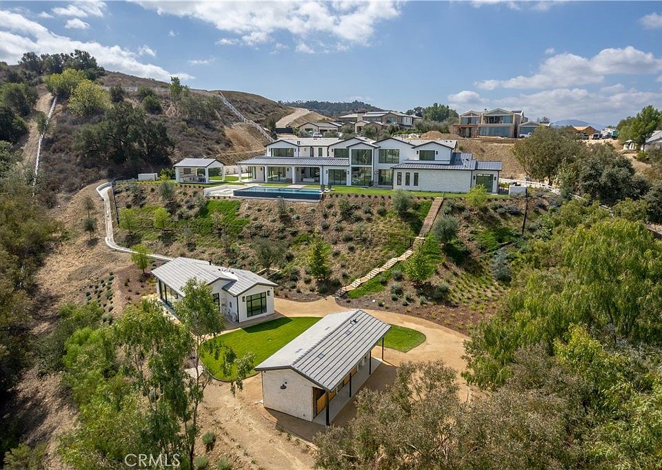 Panoramic pastoral & city light views highlight this gorgeous, brand new estate, nestled at the end of a quiet cul de sac and sited on a large private lot. This beautifully built home features a sunny, open floor plan with a stunning, center island chef's kitchen with counter seating (plus a prep kitchen) that adjoins the great room showcasing a two-sided fireplace & sliding walls of glass opening to the forever views, plus there's a big game/recreation room, a custom office, a spacious gym & wellness center with steam & sauna, a deluxe home theater with fabric covered walls, a lounge with wet bar, a glass encased, refrigerated wine cellar, both upstairs & downstairs dens, and six ensuite bedrooms in the main house, all serviced by an architectural floating staircase and an elevator. The large and luxurious primary suite includes a fireplace, all stone bath with steam shower, room sized custom closet, and a walk-out, oversize wrap-around view balcony. There are four structures on the large lot that include the main house with garages for seven cars, all highlighted by custom epoxy floors, a pool pavilion complete with barbecue center & pool bath, and on the lower pad area, a nicely private 965' guest house, and a two-stall barn/stable. The spacious grounds include a sparkling, zero edge infinity pool & spa, two covered patios, a fireplace & firepit with seating and your own private pickleball court! This trophy property also has a excellent location just a few blocks from the entry gate to Hidden Hills and close to the nearby, highly regarded public & private schools, and The Commons shopping center with it's many stores and restaurants.