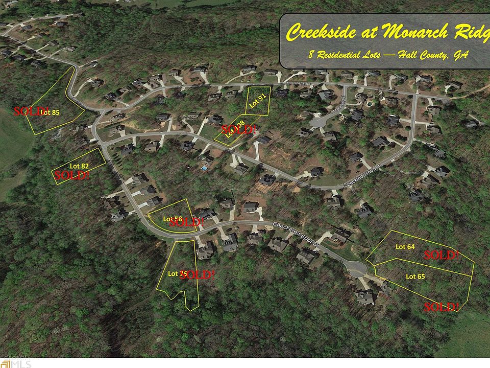 Terrific builder opportunity. Declarant rights can be transferred in sale. Minimum 1,600 Square Foot homes on lots ranging from 0.59 acres to 2.6 acres. Tremendous opportunity to build on value priced lots in established subdivision with a great resale track record. Minimum setbacks are as follows: 30' FYSB, 10' SYSB, 20' RYSB. Located in a beautifully established subdivision with over 90 homes ranging from the low $200s to mid $300s in pricing. Creekside at Monarch Ridge is located on Elrod Road which provides a short 5 minute drive to Kroger shopping center, restaurants and services. Quick access to downtown Gainesville or Dawsonville Highway corridor via Sardis Road. Only 1.2 Miles from Lanier Elementary and 3.5 Miles from Chestatee Middle and High Schools. Terrific builder opportunity. Declarant rights can be transferred in sale. Minimum 1,600 Square Foot homes on lots ranging from 0.59 acres to 2.6 acres. Tremendous opportunity to build on value priced lots in established subdivision with a great resale track record.