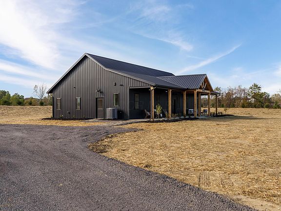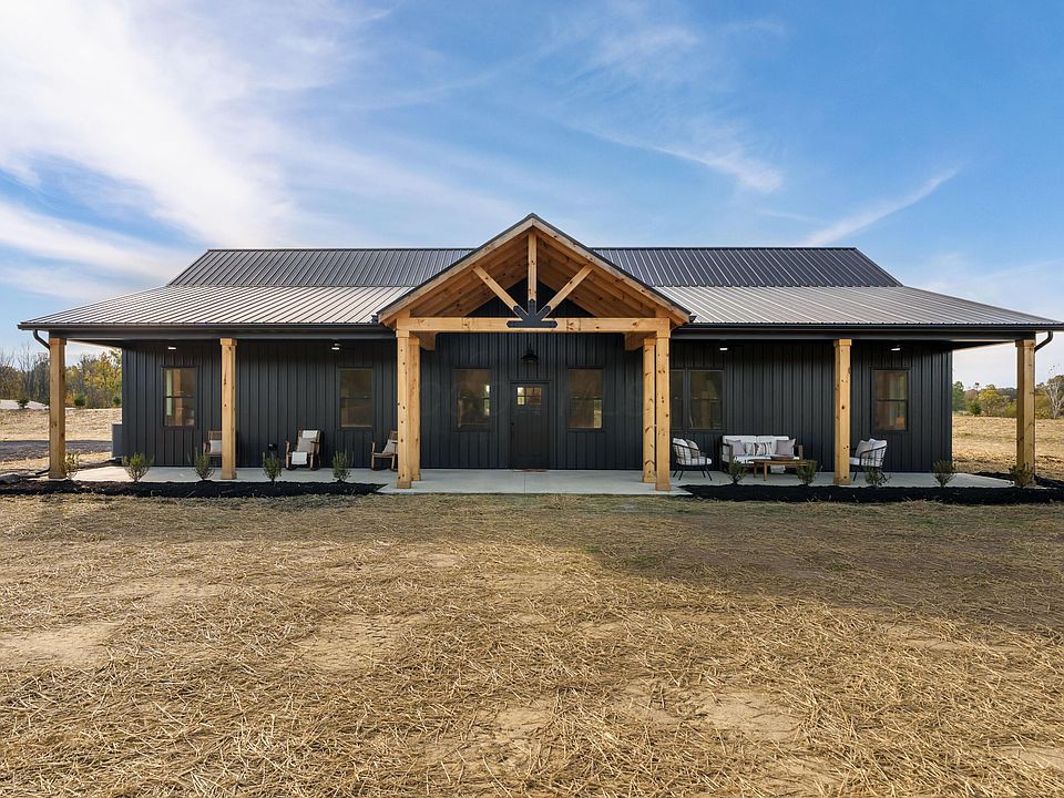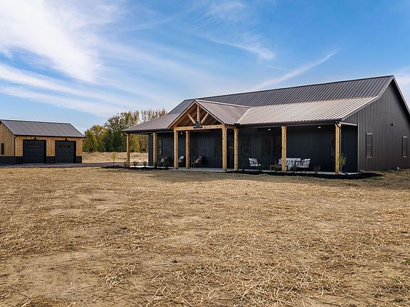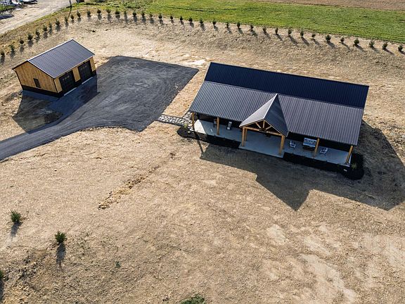 Stunning brand-new Amish-Built Barndominium on almost 4 acres, a true showcase of craftsmanship and modern design. This custom home combines timeless quality with contemporary comfort, offering over 2,000 square feet of beautifully finished living space. The striking exterior features sleek black metal siding and roof, paired with a detached, oversized two-car garage designed with extra height for larger vehicles or workshop needs. Inside, Amish handcrafted Character Hickory cabinetry anchors a gourmet kitchen accented by gleaming white quartz countertops, soft-close drawers, and premium fixtures. A floor-to-ceiling shiplap fireplace serves as the home's centerpiece, bringing rustic charm with a refined edge. The adjoining coffee bar with a built-in mini fridge and oversized pantry add both convenience and sophistication. Throughout the home, wide-plank luxury vinyl flooring enhances the spacious flow, while natural light fills every room. The layout includes four generous bedrooms, highlighted by a primary suite featuring a custom tile shower and thoughtful finishes that make every day feel like a retreat. Additional upgrades include a tankless water heater, extensive landscaping, and a private drive that ensures peace and seclusion from the moment you arrive. Blending the craftsmanship of Amish tradition with the style and functionality of today's best designs, this home is the perfect balance of rural tranquility and modern luxury.