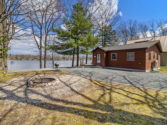 Newly constructed stair way leading down to a well groomed sandy beach area with beach house, electric, dock and new seawall. 12 x 20 garage with finished storage area, newer 5'' well and more. Located on a double lot. Enjoy a beautiful 110 acre all-sports lake well known for excellent fishing and boating enjoyment. Picturesque!