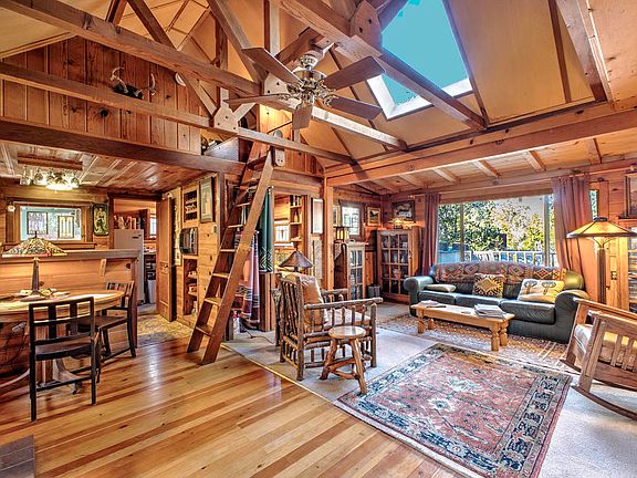 HIDDEN BUNGALOW COTTAGE. Cute and cozy original 1940's Idyllwild cabin with vintage pine and cedar paneling in an open beam and exposed truss ceiling design that adds a dramatic timber effect and a definite Wow! factor. There are many classic arts and crafts finish details throughout, including in the spacious living area that has original Douglas fir flooring, painted brick fireplace, skylight and access to a large rear deck. A single bedroom has its' own bath with shower, plus there are two separate complementary loft areas accessed by ladders, one with two twin beds and the other used as a small library/den. There is also a second bath with shower, kitchen with wood counters, vintage linoleum flooring and open shelving, a separate dining area and a service porch. Located on desirable Double View Dr., this near level property offers easy access, lots of parking and plenty of usable areas in front and back. Selling partially furnished, including most kitchenware.