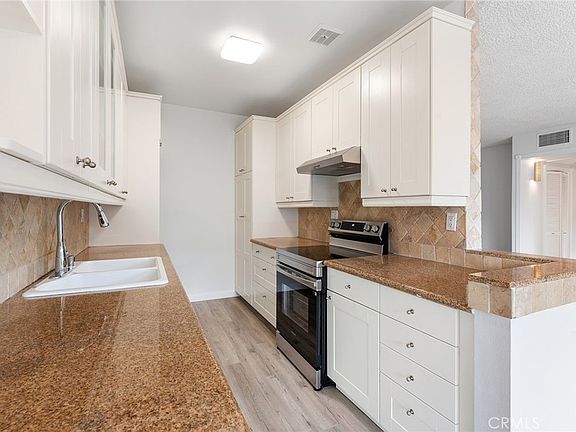 Extremely rare one level Penthouse corner unit in Newcastle Manor boasting the largest floor plan in the complex with 2 bedrooms, 2 bathrooms, 1,117 SF, and 2-car gated and covered parking! The unit is also privately situated in the very back of the complex making it the ideal quiet location away from any street noise. Step inside to find an upgraded and spacious sunlit open floor plan featuring a large living room with new laminate wood flooring found throughout and sliding glass door that opens to a large balcony deck with drop down sun shade. This unit’s unique floor plan features a second bonus living space with built-in storage ideal for den/formal dining/office/gym/etc. The remodeled kitchen has new white shaker cabinetry with pantry storage space, granite counters, stainless appliances including new Samsung built-in range and vent hood, dishwasher, and separate breakfast nook. The two bedrooms are located on their own private wing with great hallway storage and linen closet. The primary bedroom boasts two walk-in closets with built-ins and private en-suite upgraded bathroom with granite counters, tile backsplash, and walk-in shower with seamless glass door. The second large bedroom also has a walk-in closet with built-ins with access to an upgraded hall bathroom with granite counters, tile backsplash, and separate toilet room with bathtub and shower. The unit has gated and covered parking for 2 cars with additional built-in storage lockers. Community amenities include a heated swimming pool and spa, gym, outdoor BBQ area, recreational rooms, lushly landscaped courtyard with seating areas, lobby with controlled access for guests and packages, and private laundry room (located very close to the unit for easy access). HOA also covers:water, trash, and sewer costs. Adjacent to Ventura Boulevard shops and restaurants, Balboa Park, and quick access to the freeways.