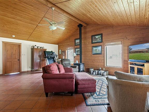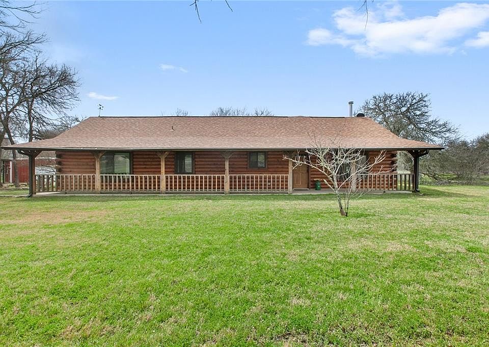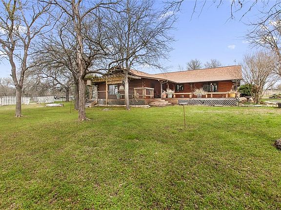 Peaceful country living in Elgin awaits you at this three-bedroom, two-bathroom home, nestled on 7.998 acres. The house has a log exterior, is paired with a wrap-around deck, a porch swing, and has multiple places to enjoy the views. Walk-in and be greeted with the living area, which features vaulted ceilings, large windows that pour in light, and an antique-style wood-burning fireplace. The kitchen area has ample cabinet space, stainless steel appliances, garden window, bartop seating, plus a perfect view of the dining space and the mason jar light fixture. The spacious master bedroom is dressed with artistic ceilings, light-colored wood style laminate floors, and an attached bathroom with a double vanity, soaking tub, and a step-in shower. On the property, you will find a fenced-in garden space with irrigation, a carport, creek access, and a 24x24 workshop! Great location only six miles from main street Elgin and 30 minutes to Austin.