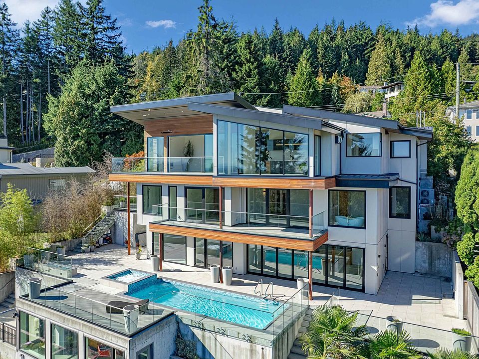 This modern masterpiece showcases clean architectural lines, expansive glass & natural materials, offering panoramic ocean and city views. The main floor features bright open living spaces with high ceilings, floor-to-ceiling windows & seamless flow to a large terrace. Gourmet and wok kitchens are equipped with highend appliances and custom cabinetry. A rare dual primary suite layout provides ideal flexibility for families or multigenerational living, each with spa-inspired ensuites, walk-in closets, and private balconies. The lower level includes a spacious recreation room, home theatre, and direct access to the outdoor oasis with pool, hot tub, generous patio and the pool house. Thoughtfully designed for refined luxury and effortless modern living. Open Oct 9&11, Thurs 10-12 & Sat 2-4pm