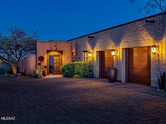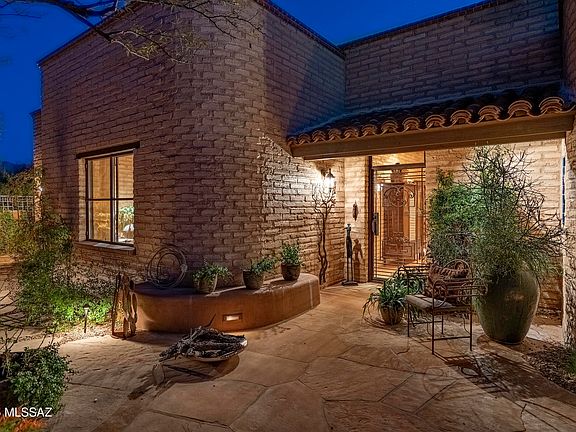 Situated on a premium hilltop lot, within the prestigious guard-gated community of The Estates at Honeybee Ridge, this Authentic Mud Adobe home is a masterful composition of materiality, texture, and light. Designed to embrace the breathtaking panoramas of the Catalina Mountains and the vibrant cityscape to the south, this residence is a sanctuary of refined desert living, where every detail is a celebration of craftsmanship and authenticity. The journey begins at the dramatic antique entry doors, leading into a serene courtyard framed by the soft cascade of a Cantera baptismal fountain, sourced from San Miguel de Allende. Inside, a striking Diego Rivera mural welcomes, setting the tone for a home where art and architecture harmonize. Throughout the home, viga beamed ceilings accentuate the authenticity of the adobe construction, while custom iron doors and windows weave an artisanal narrative.